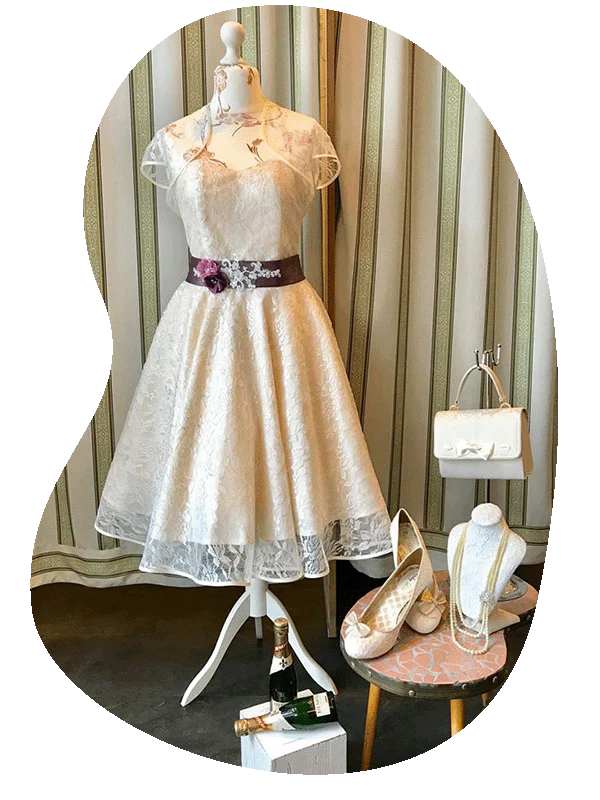 Wenn Du bei uns einen Termin zur Anprobe buchst, erwarten Dich neben Sekt und Selters auch exklusiv die beliebtesten Modelle des Ateliers Belle Couture, Stoffproben und Spitze in diversen Farben und natürlich auch Accessoires und Schuhe. Denn vom Scheitel bis zur Sohle, kannst Du dich bei Dotty & Dan für Deine Vintage Hochzeit ausstatten. Wir nehmen uns Zeit für Dich, Deine Vorstellungen und Wünsche. Mit viel Einfühlungsvermögen und natürlich Spaß machen wir uns gemeinsam auf die Suche nach dem perfekten Vintage Brautkleid für Dich.
