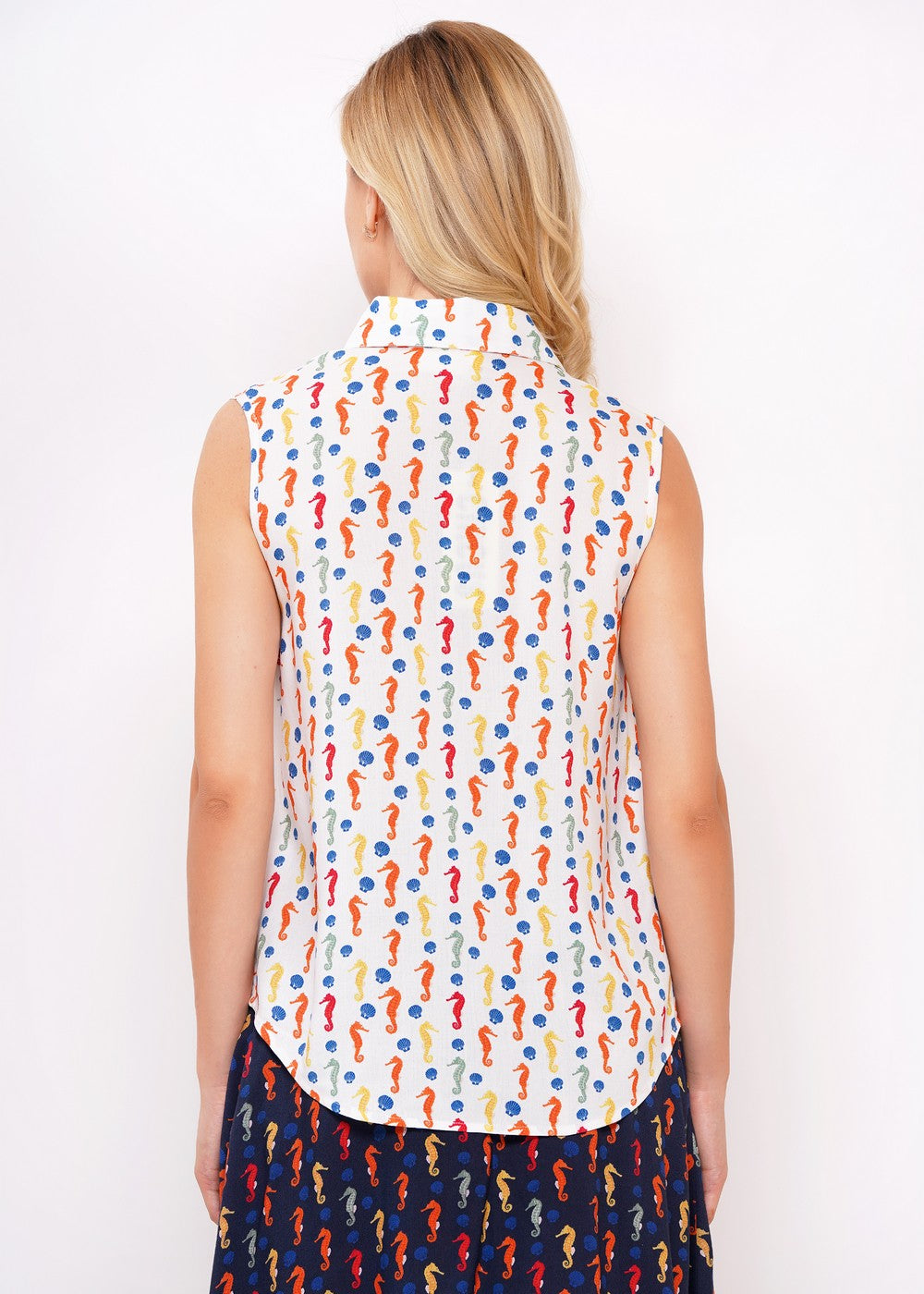 Die ärmellose Bluse Seahorse bringt sommerliche Leichtigkeit und verspielten Charme zusammen. Das feine Seepferdchen-Muster auf ivorfarbenem Grund wirkt frisch, besonders – und trotzdem erstaunlich zeitlos. Der klassische Hemdblusenkragen und die durchgehende Knopfleiste geben dem fröhlichen Print eine ruhige, klare Form.
