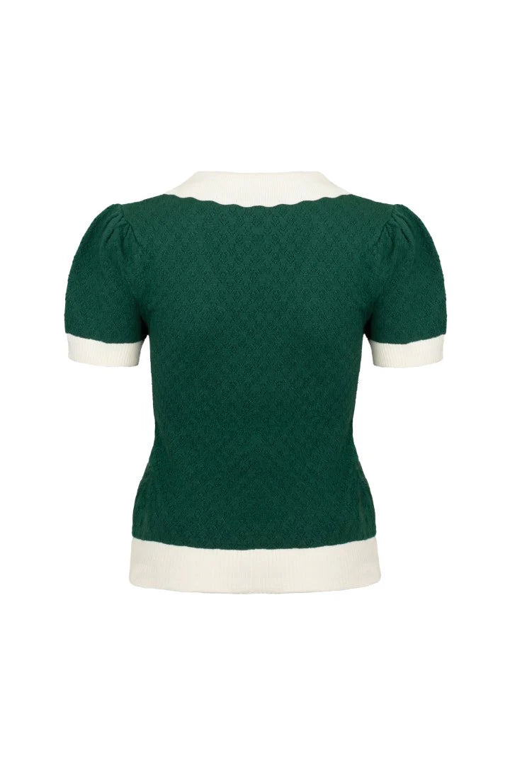 Ein Hauch Märchenwald für Deinen Kleiderschrank: Das Genevieve Top verzaubert mit seinem tiefgrünen Jacquard-Muster, dem cremefarbenen Kragen und der liebevollen Pilz-Stickerei. Der feminine Schnitt mit Herzknöpfchen und Puffärmeln bringt Deine Taille schön zur Geltung – ob zu Swing-Röcken, High-Waist-Hosen oder Jeans im Retro-Look.