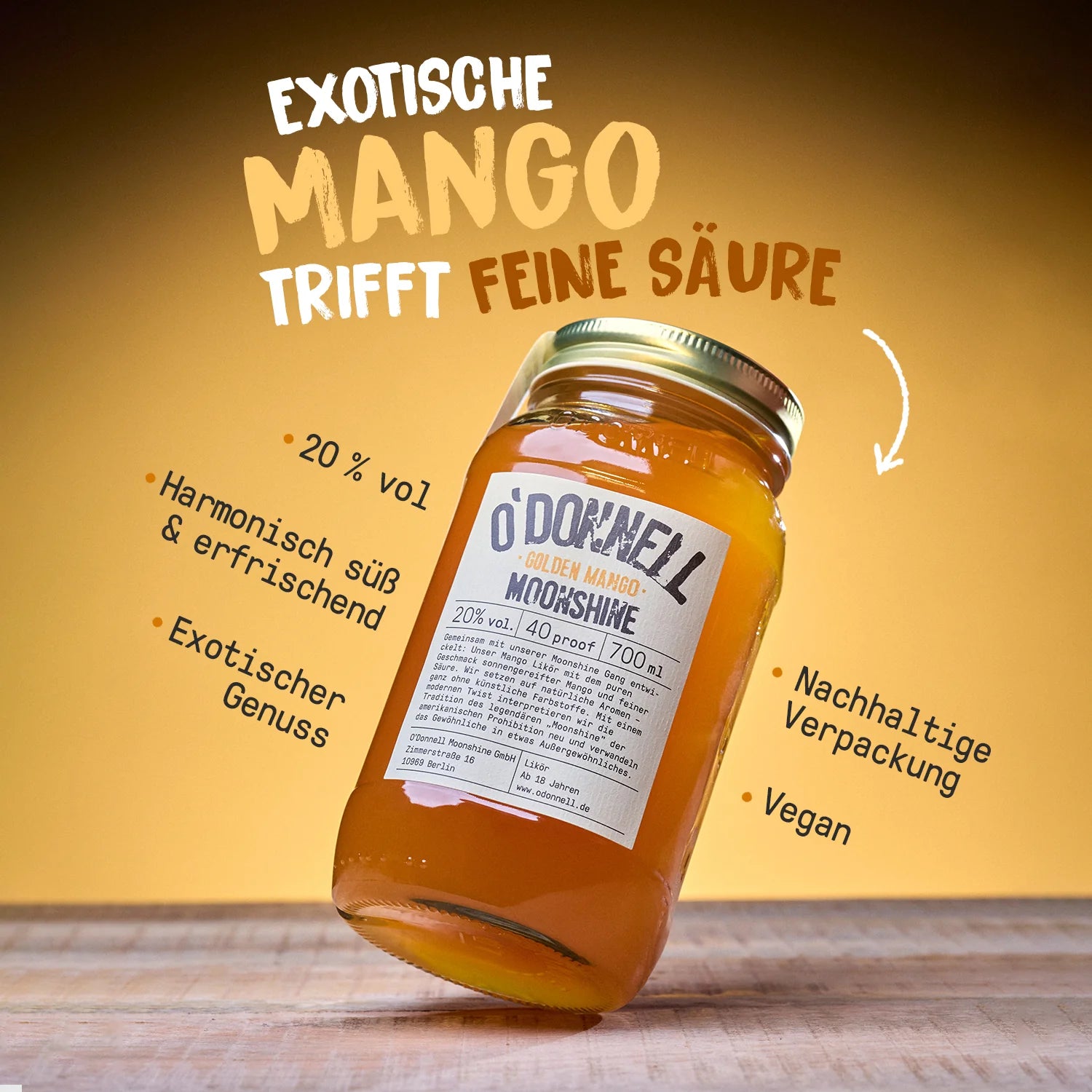 Sonnengereifte Mango trifft feine Säure – die O’Donnell Moonshine Golden Mango ist der exotische Sommerdrink für Genießer. Fruchtig, erfrischend und gemeinsam mit der O’Donnell Gang entwickelt – das pure Geschmackserlebnis im ikonischen Mason Jar!
