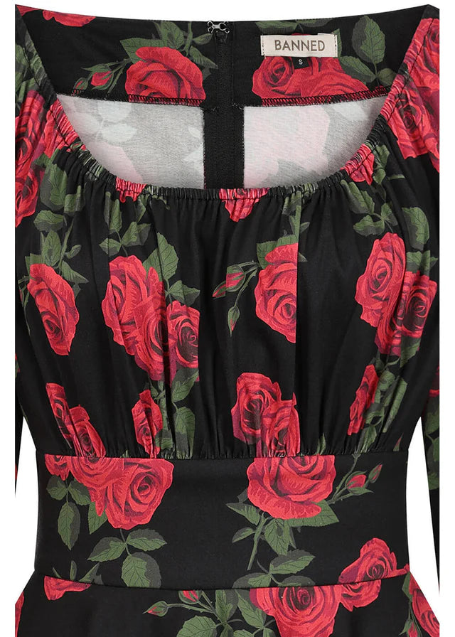 Das Mina Romantic Swing Dress von Banned vereint einen klassischen 50s-Schnitt mit einem ausdrucksstarken Rosenprint auf tiefschwarzem Grund – feminin, zeitlos und absolut alltagstauglich.