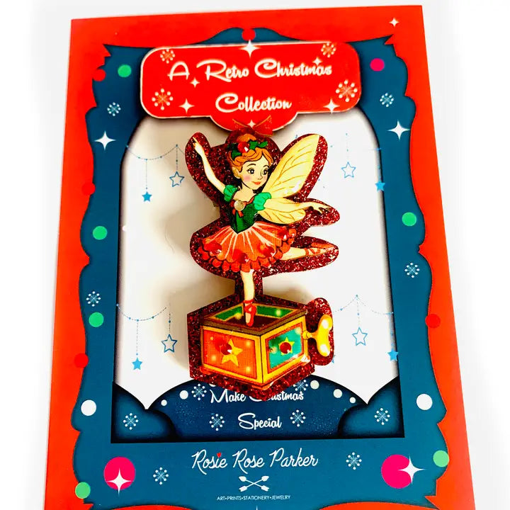 Eine verspielte kleine Weihnachtsfee, die direkt aus einer Musikbox springt: Diese handgefertigte Brosche kombiniert geschichtetes Holz, Acryl und ein funkelndes rotes Finish für einen echten Mid-Century-Zauber. Perfekt für Outfits, die zur Adventszeit ein kleines bisschen Märchen brauchen.